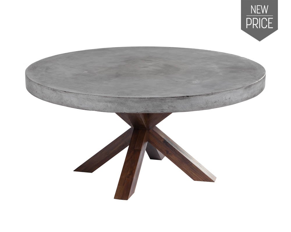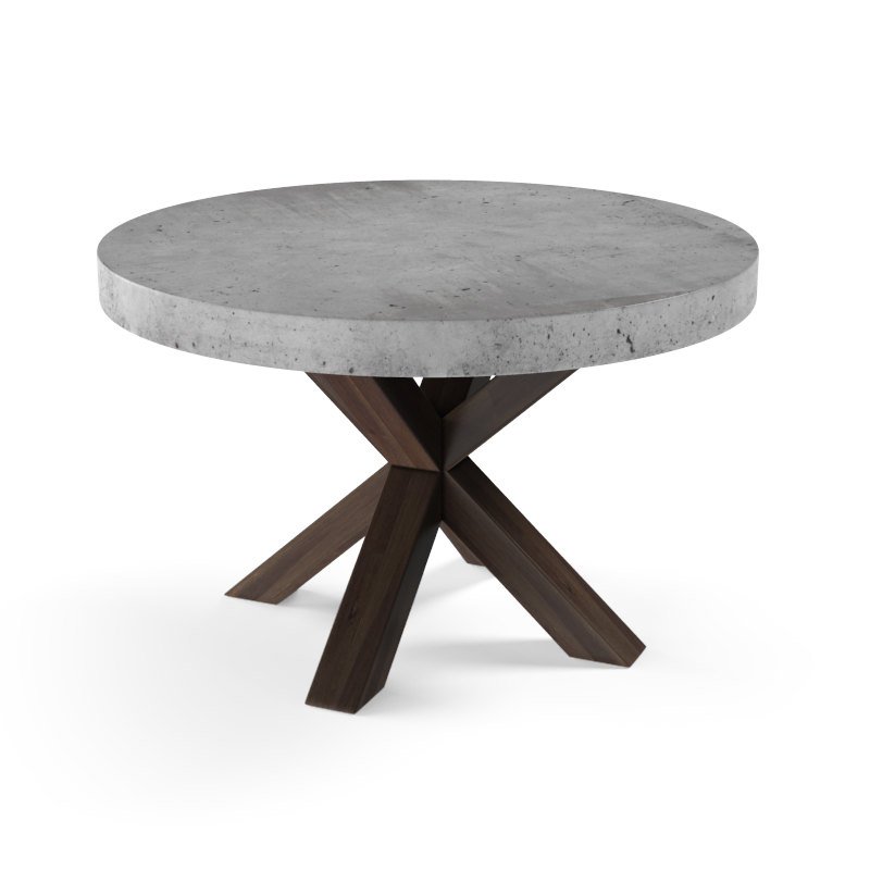 This incredible round dining table features a 10cm concrete edge top for an industrial look. A contrasting thick base made from acacia wood with a light espresso finish provides the perfect balance of materials. Crafted from a natural concrete mix each piece will look different. Variations in colour texture imperfections surface scratches and non-structural hairline cracks are considered inherent and valued qualities of the material. As wood is an organic porous material these pieces will contain natural variation of texture and may also exhibit fine indentations and cracks. Wood pieces will also display a disparity of colour and grain and visible knots and burls that add to the character of each piece. Dimensions: 47″D x 29.50″H