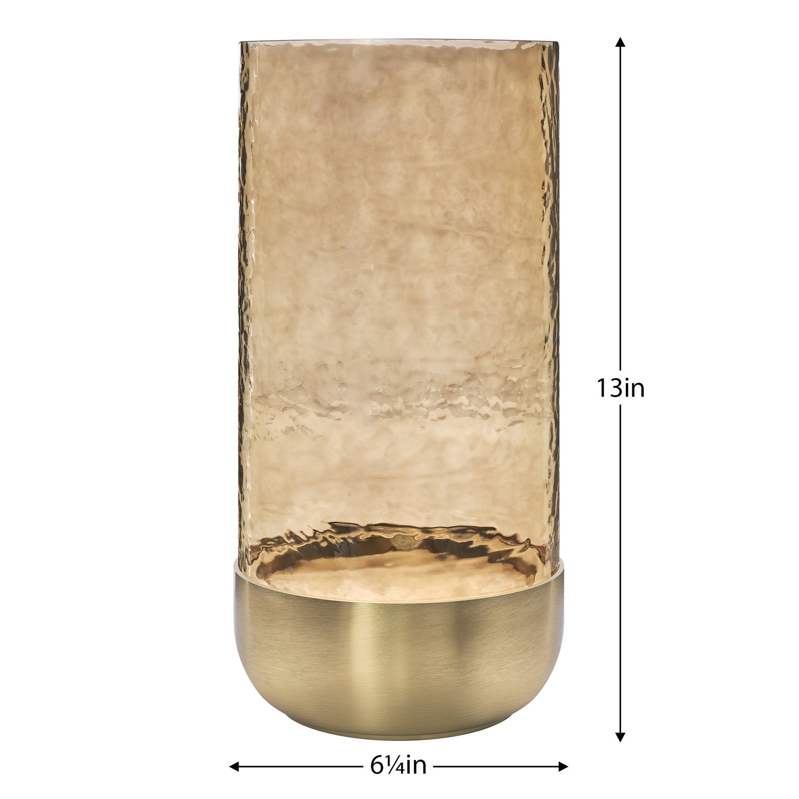 Elevate your space with this striking amber-tinted hurricane glass featuring a captivating waterfall texture that plays beautifully with light. Set on a brushed metallic gold base this pillar candle holder adds a luxurious modern touch to any room. A perfect statement piece for contemporary transitional or minimalist interiors. Dimensions: 6.25 inch length x 6.25 inch width x 13 inch height. Candle cup: 5.75 inch diameter