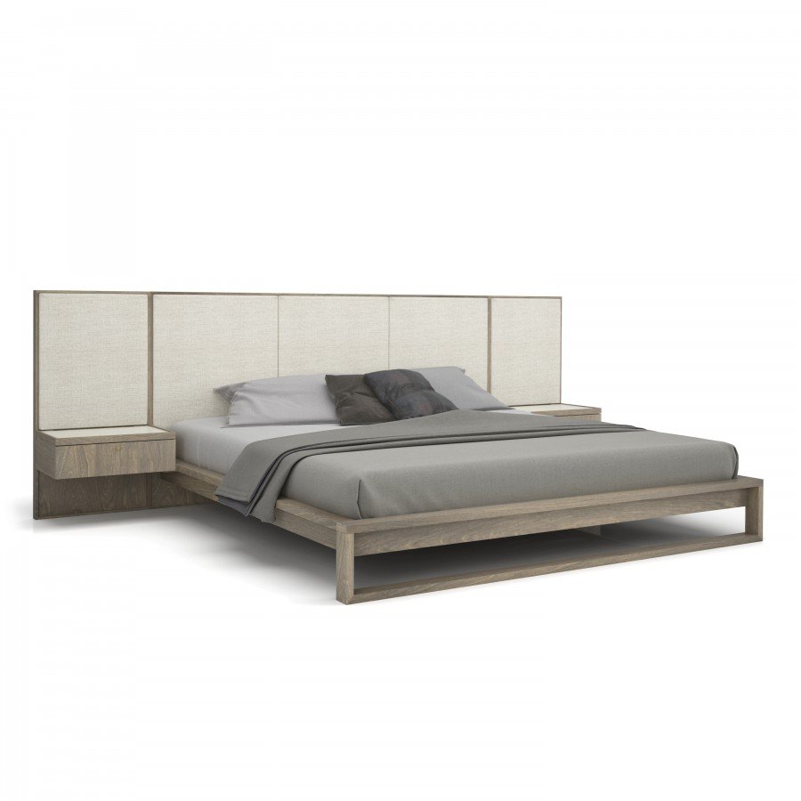 Upholstered headboard with upholstered extensions 1 drawer night table. Acid etched lacquered glass top choice of brass or black handles.. Custom made in Canada. Dimensions: 111 1/2” / 129”W x 85”D x 44”H
