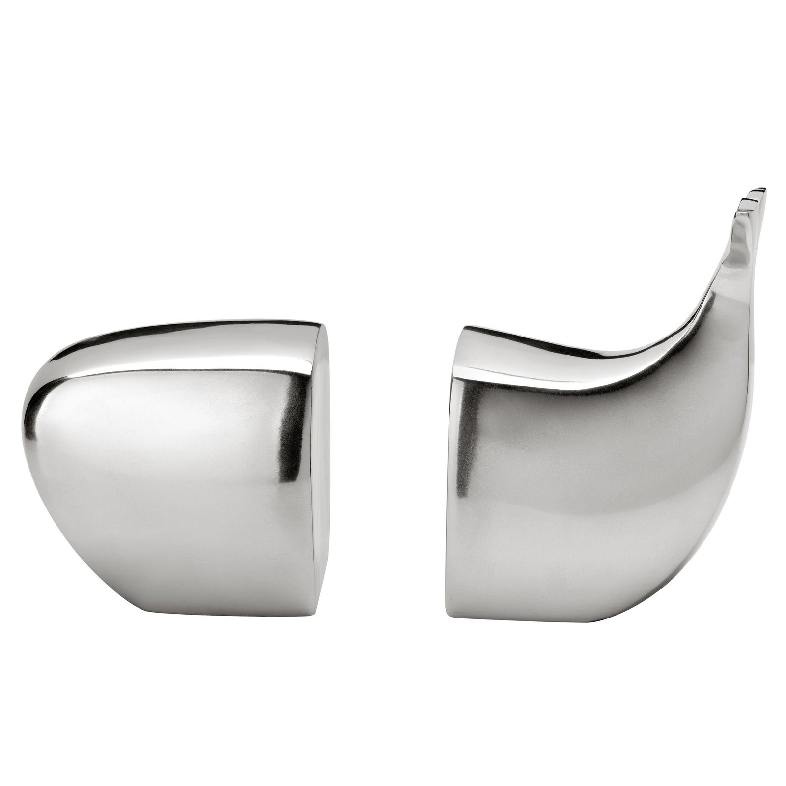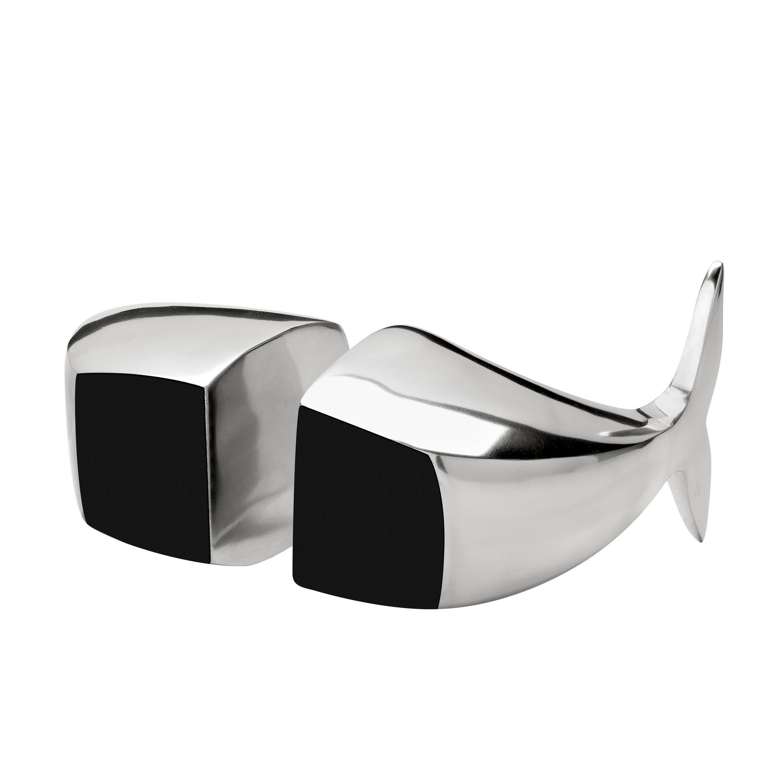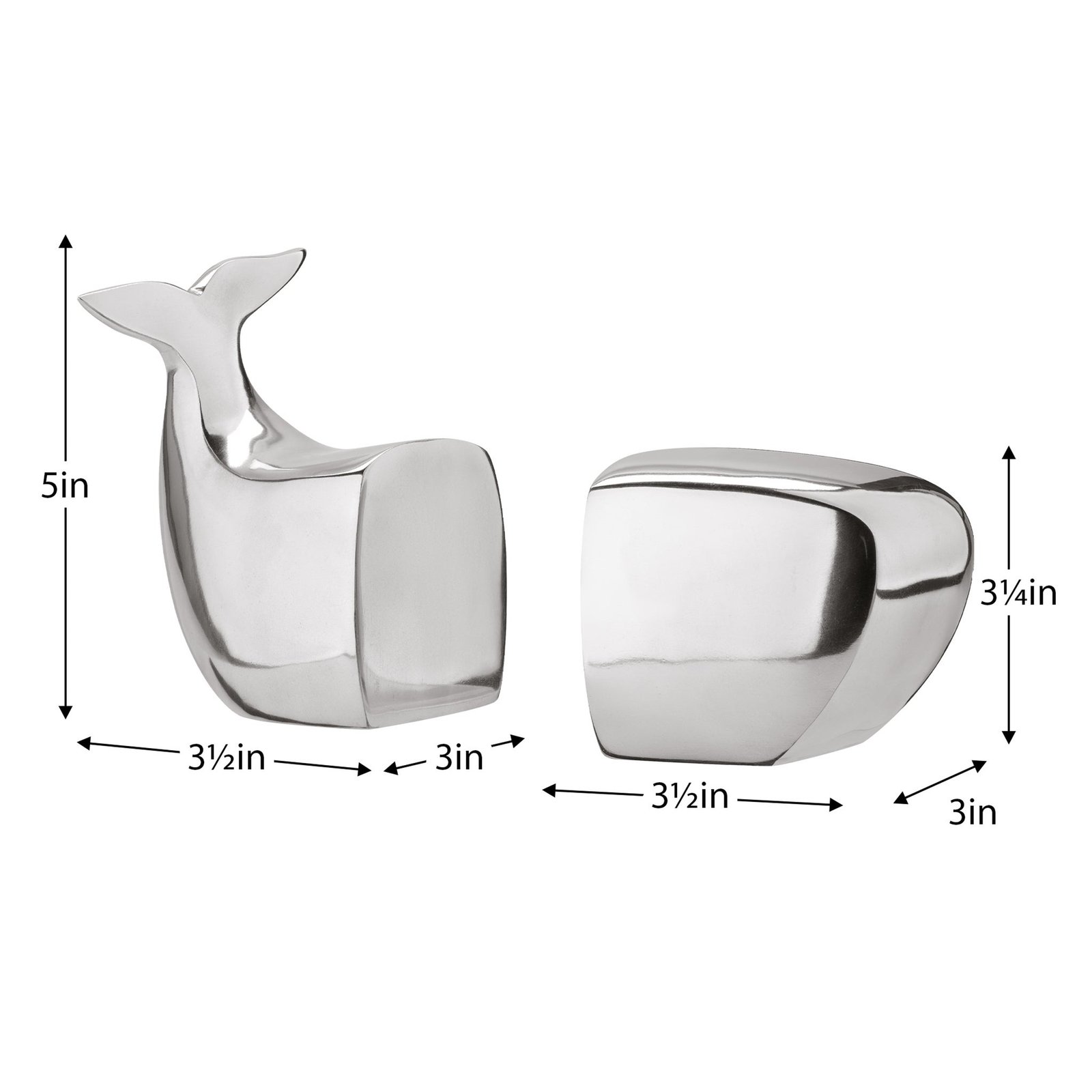 This two-piece bookend set forms the silhouette of a whale crafted in sleek polished aluminum for a modern sculptural look. With the head on one side and the tail on the other it frames your books with a sense of movement and whimsy. A functional accent that doubles as a conversation piece. Dimensions: Front: 3.75 x 3 x 3.25 inch height. Back: 3.75 x 3 x 5.25 inch height. Total length: 7.5 inches