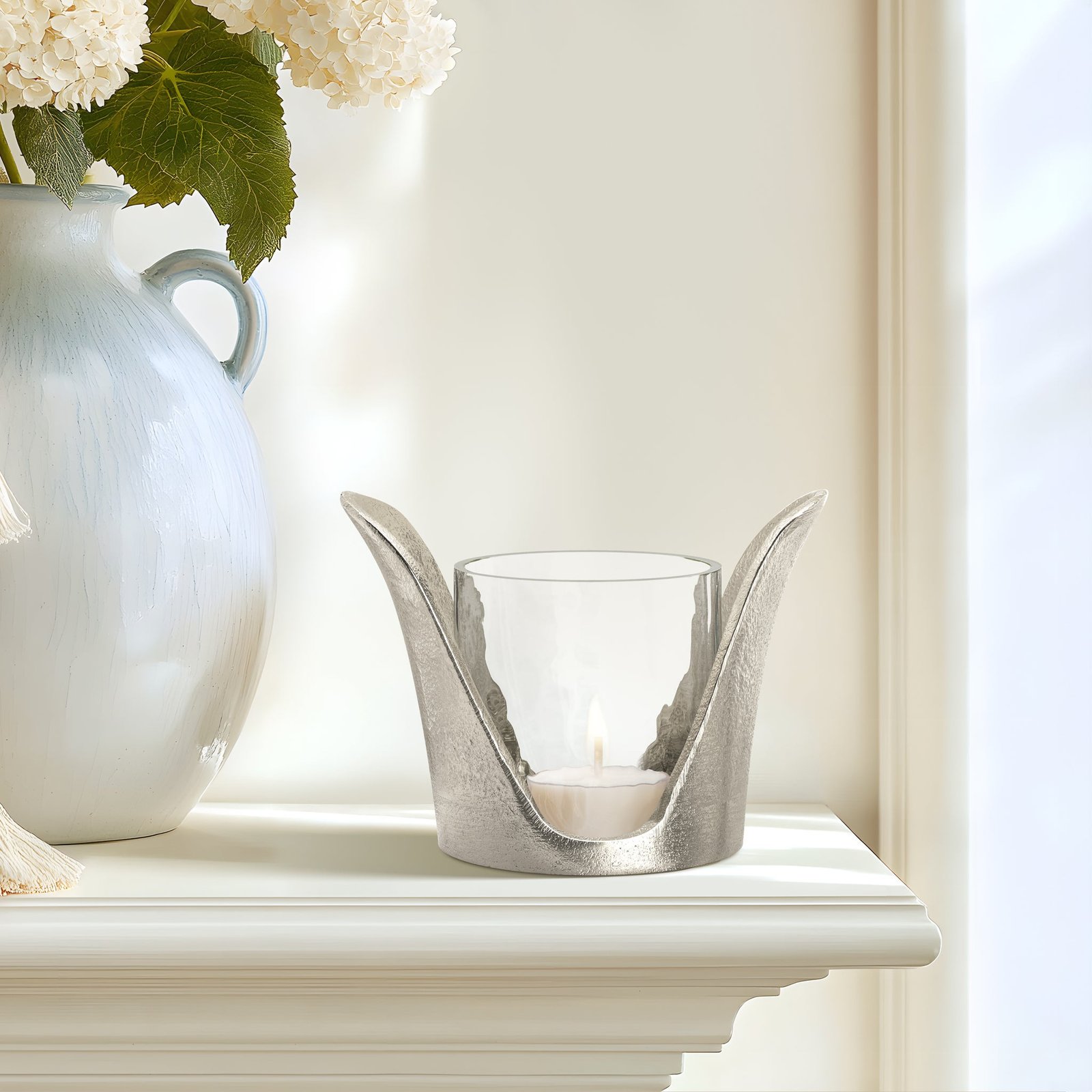 Create a warm inviting glow with this aluminum tealight holder featuring graceful wing-like flared sides and a textured glass insert with a gentle wavy pattern. Its elegant design adds soft dynamic light to any space. A stylish accent perfect for mantles shelves or tabletops. Dimensions: 4.25 inch length x 3.5 inch width x 4 inch height. Glass insert: 3 x 3 inch