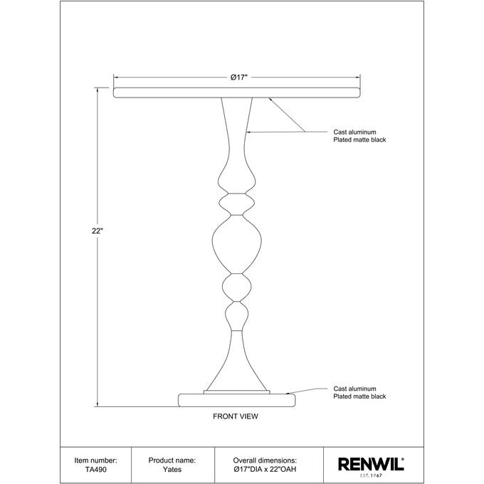 Upgrade your living space with the stylish Yates 17″ Wide Side Table in Matte Black. Featuring high-quality cast aluminum construction this table exudes durability and is built to last. With a weight capacity of 17.6-22.0 lbs it’s perfect for holding your favorite decor pieces and essentials. The plated finish provides protection against wear and tear while the sleek matte black design adds sophistication to any decor style. Whether you’re using it as a side table in your living room or as a nightstand in your bedroom the Yates 17″ Wide Side Table is a must-have addition to your furniture collection.