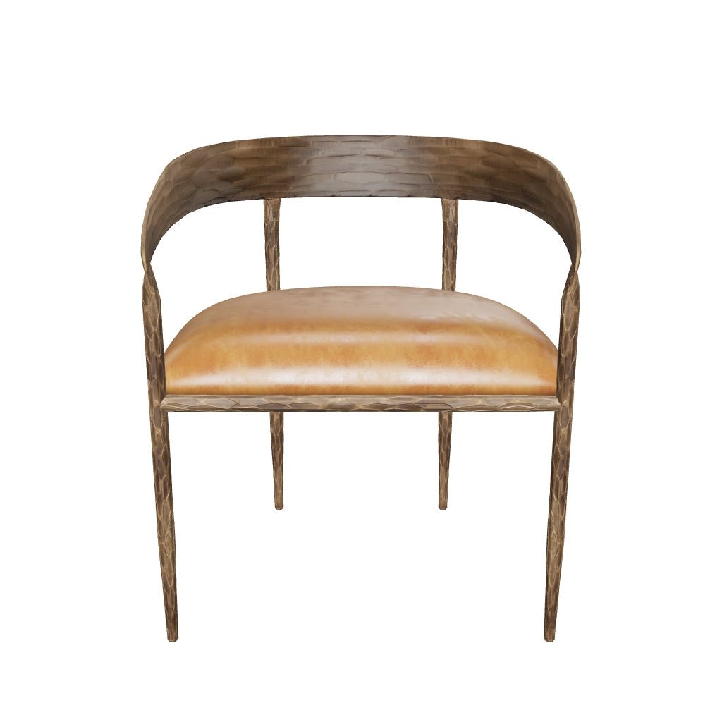 The Zanatta Dining Armchair is all about the subtle details. The hammered metal detailing in the antique brass curved frame provides visual interest that will stand out in any dining space. A tan leather seat completes the look. Handle with Care: This design has been crafted with aniline leather. Leather is a natural material; as such colour variations markings wrinkles grooves and light scratches are acceptable and appreciated characteristics. No two pieces are alike. Visit our Product Care page for more information on how to ensure the lasting beauty of this piece. Made in India. With refined craftsmanship this design was brought to life by skilled local artisans. Due to the nature of handcraftsmanship unique imperfections such as fissures markings and variations in colour and shape are welcomed and appreciated characteristics for a truly one-of-a-kind piece. Dimensions: 25″W x 21″D x 30.25″H