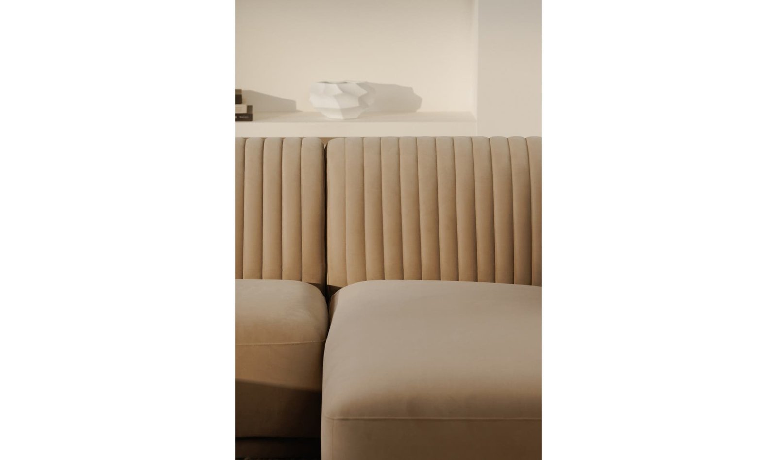 The Zandro sectional brings a tasteful touch to any room with its plush velvet upholstery a soft touch with subtle elegance. Its vertical channel detailing along the back and arms adds a sophisticated visual texture while the warm neutral color allows it to blend seamlessly into any d?cor without overwhelming.. Dimensions: 116.75? W X 71.0? D X 27.5? H